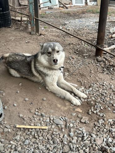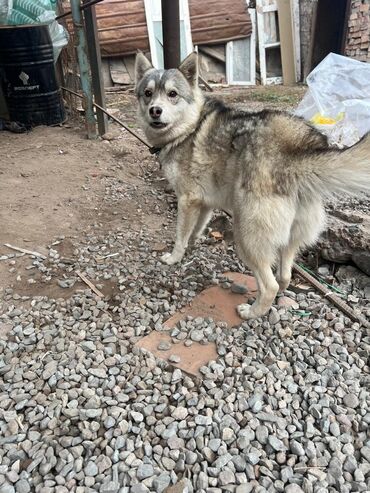 Собака средних размеров, тип северной ездовой/лайкообразной породы. Шерсть густая двойная, серо-белого окраса с темным подпалом по хребту, воротником и пушистым хвостом. Уши стоячие, морда клиновидная, глаза миндалевидные. На фото собака на цепи с ошейником.
