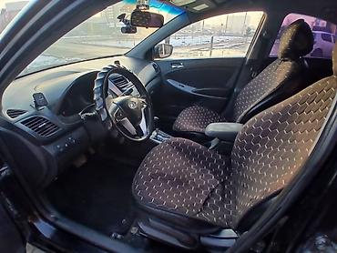 Hyundai Accent (седан), черный цвет, регистрация KG (номер на фото). Основные особенности: - Бензиновый двигатель, механическая коробка передач. - Передний привод. - Салон черный, ткань/эко‑кожа...