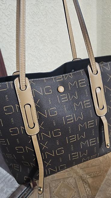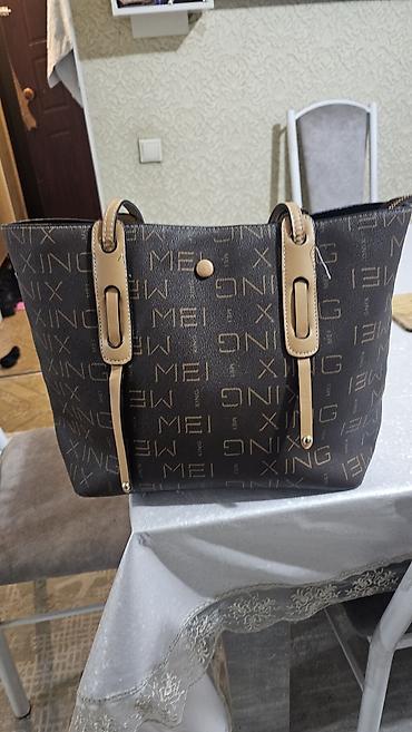 - Материал: плотная экокожа с тиснением, коричневая база с бежевым монограммным принтом «MEI XING».