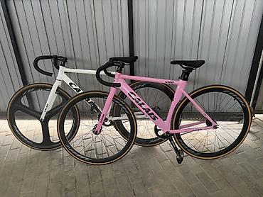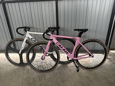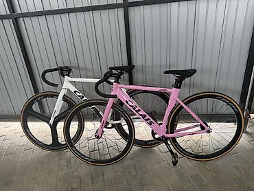 Спортивный трек/фикс-байк Me?ll? (надпись на раме) с жесткой карбоновой/алюминиевой аэро-рамой и прямой карбоновой вилкой. Формат — singlespeed/фикс: одна звезда спереди, один cog сзади, без перекл...