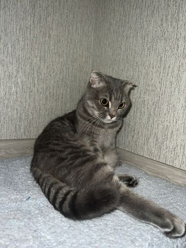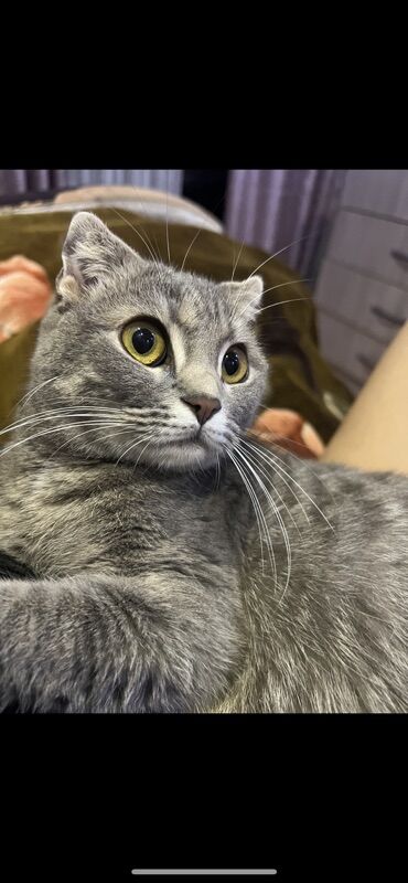 Шотландская вислоухая кошка, окрас серый табби с серебристым переливом. Полные круглые глаза янтарного оттенка, аккуратные полусложенные ушки, мягкая густая плюшевая шерсть, выразительные белые вибриссы. Компактное, гармоничное телосложение, толстый пушистый хвост с контрастными кольцами.