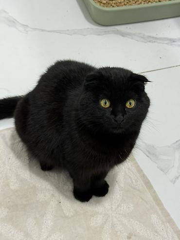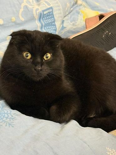 Шотландская вислоухая кошка, окрас: сплошной чёрный (black solid).