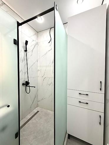 - Санузел с душевой зоной в керамограните «под мрамор», стеклянная перегородка в черном профиле, встроенный трап, душевая система черного цвета, высокий шкаф для хранения.
