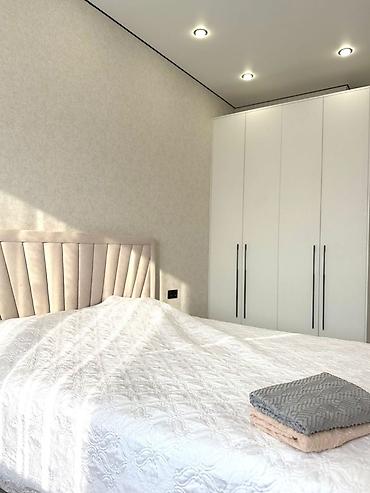 - Спальня с мягким изголовьем кровати, большим платяным шкафом до потолка.
