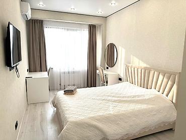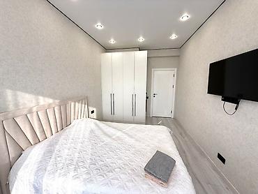 - Спальня с широкой кроватью с мягким изголовьем, большим шкафом-купе, рабочей/туалетной зоной с круглым зеркалом и настенным ТВ.