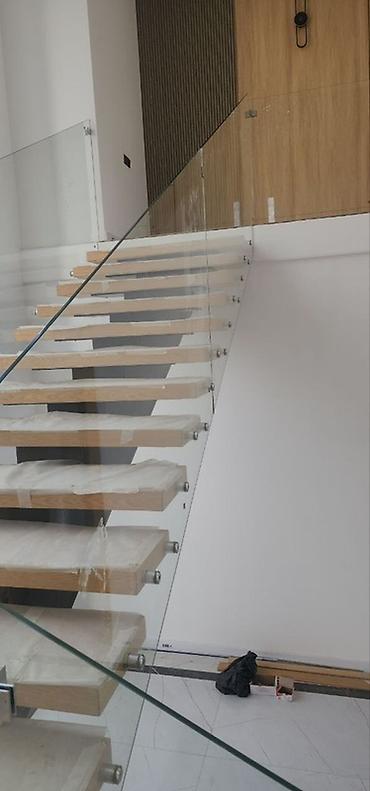 - Ограждение: цельностеклянные панели из закалённого стекла, фиксируются точечными креплениями к торцам ступеней и площадке; есть стеклянная дверь/проём на верхней площадке.