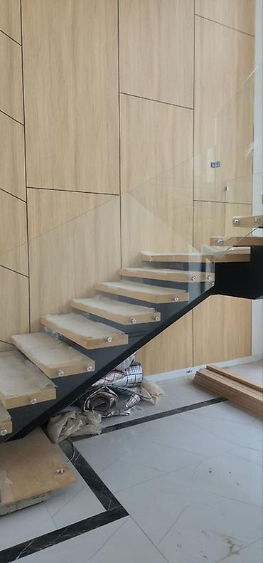 - Цвета и материалы: черный металлический косоур, светлое дерево ступеней, прозрачное стекло.