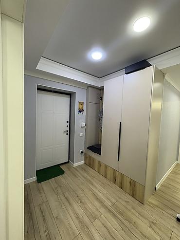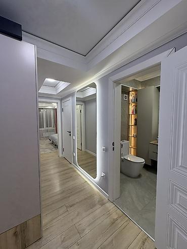 - Прихожая: встроенный шкаф-купе с высокой секцией для верхней одежды, закрытая тумба с длинной вертикальной ручкой, ниша-сиденье, зеркало в полный рост с контурной LED‑подсветкой, декоративные потолочные карнизы и точечные светильники. Напольное покрытие — износостойкие доски под светлое дерево, плинтус в тон стенам.