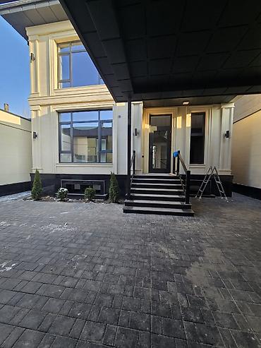- Входная группа с широкими маршевыми ступенями и перилами, козырек по периметру двора с встроенным освещением.
