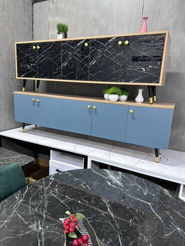 Нижняя тумба оснащена четырьмя матовыми синими дверцами и корпусом, имитирующим светлое дерево. Обе тумбы установлены на стильные металлические опоры черного цвета с золотистыми наконечниками и дополнены круглыми золотистыми ручками. Этот комплект идеально подходит для создания современного интерьера в гостиной или столовой, предлагая функциональное хранение и эстетичный вид.