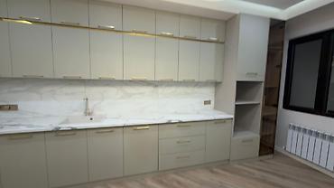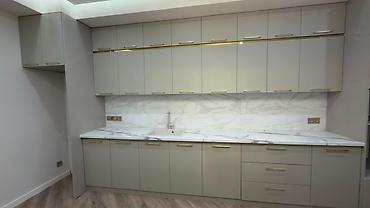 - Столешница и фартук под белый мрамор с серыми прожилками; мойка интегрирована в столешницу в тон.