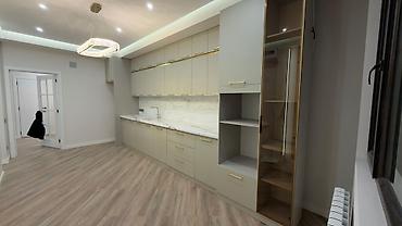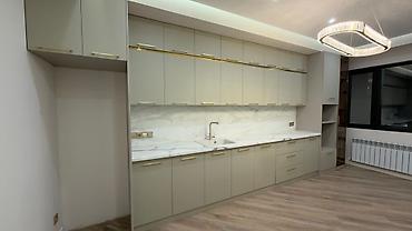 - Фасады гладкие, глянцевые, светло‑серого оттенка; ровные линии и скрытая фурнитура создают минималистичный вид.