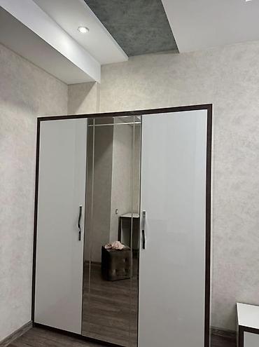 - Шкаф распашной 4‑дверный: две глухие створки, центральные зеркальные двери, длинные металлические ручки. Внутри предусмотрено отделение под вешалки и полки (зеркала во весь рост визуально расширяют пространство).