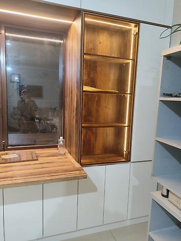 - Освещение: встроенные LED‑линии под верхними шкафами и в витринах для равномерной подсветки рабочей поверхности и декоративного эффекта.