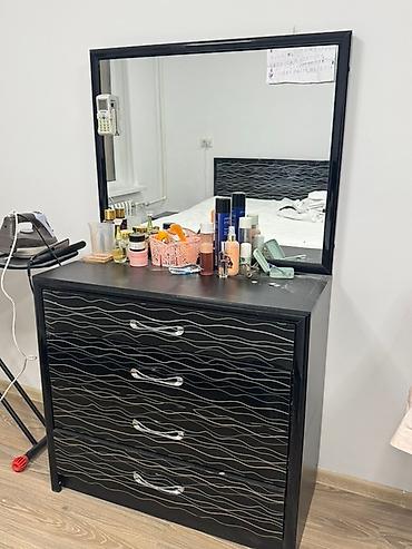 - Комод с 4 глубокими выдвижными ящиками и большим настенным зеркалом над ним — удобно для хранения белья и косметики.