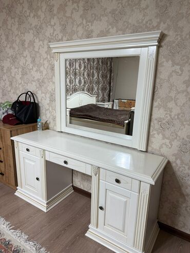 - Туалетный стол/консоль с большим настенным зеркалом в раме: центральный ящик и две секции по бокам (дверца + верхний ящик), широкая столешница.