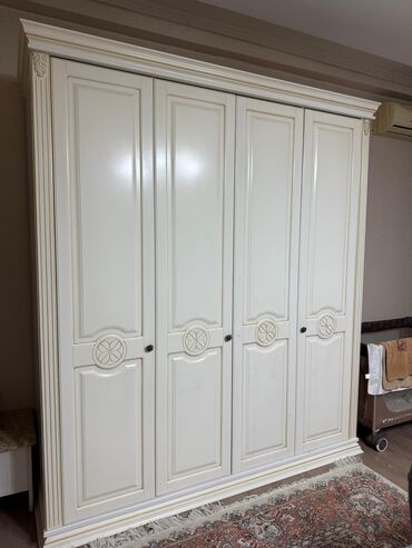 - Четырёхдверный платяной шкаф с филёнчатыми дверцами и круглыми орнаментами на средних панелях; карниз и цоколь с профилем.