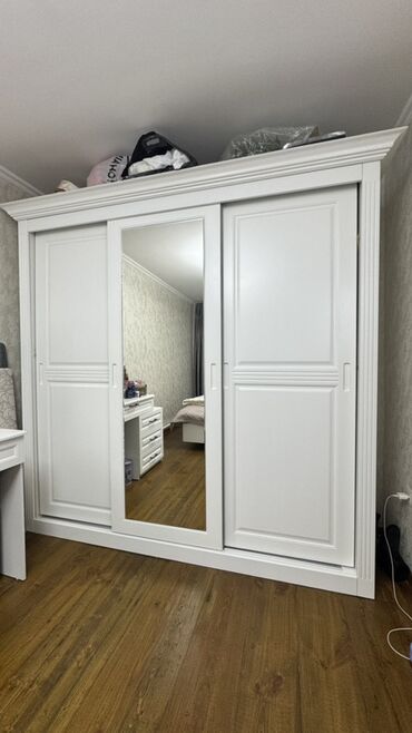 - Шкаф-купе трехдверный с центральным большим зеркалом, фигурный карниз по верху, фасады с фрезеровкой, встроенные ручки.