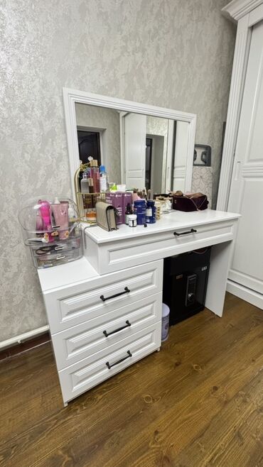 - Туалетный столик/трюмо с большим зеркалом: левая тумба с тремя глубокими ящиками на направляющих, выдвижная центральная столешница/ящик, ниша под тумбу/сейф.