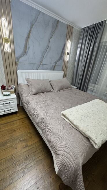 - Кровать двуспальная с высоким изголовьем рельефной панели, под матрас 160×200 см (визуально).