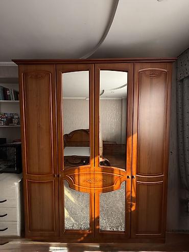 - Шкаф четырехдверный со встроенными зеркалами на центральных фасадах. Внутри предусмотрены секции под одежду: отделения под вешалки и полки. Фасады с фигурной фрезеровкой и накладным декором.