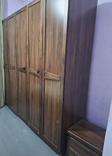 - Шкаф платяной пятидверный, высокий, с распашными дверцами и фигурными горизонтальными ручками. Корпус и фасады в одном декоре под натуральное дерево.