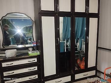 - Шкаф-купе/распашной секционный: три створки по центру с зеркалами, боковые секции с глухими дверцами, верхние антресоли, нижние выдвижные ящики. Удобные металлические ручки, зеркала во весь рост.