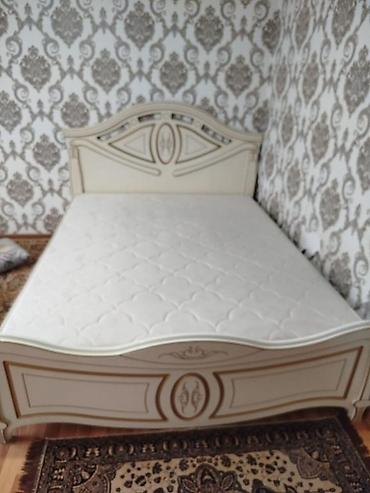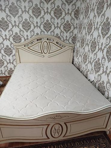 - Двуспальная кровать с изголовьем и изножьем фигурной формы, орнаментальные вставки. Основание под матрас. Матрас на фото в комплекте.