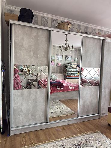 - Шкаф-купе трёхстворчатый. Центральная дверь — сплошное зеркало; боковые двери — сочетание бетона с зеркальными вставками с ромбовидной раскладкой. Рамы дверей алюминиевые, раздвижная система на нижней направляющей.