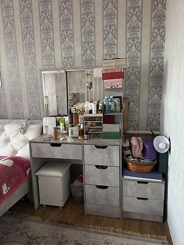 - Туалетный столик/трюмо с большим прямоугольным зеркалом. Столешница и фасады в том же бетонном декоре. Секции хранения: