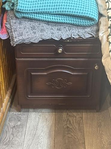 - Прикроватная тумба: верхний выдвижной ящик и нижнее отделение с откидной дверцей, декор в едином стиле с комодом.