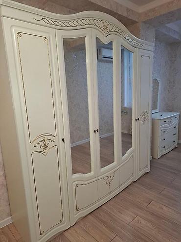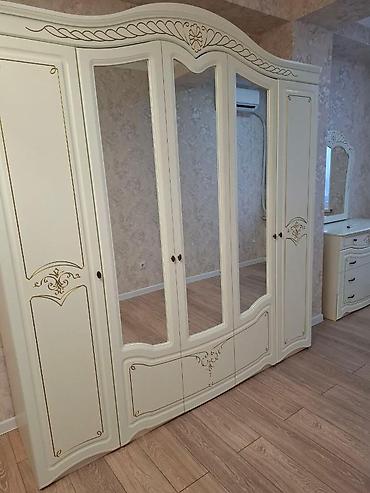 - Шкаф 5‑дверный с центральными зеркалами: распашные двери, нижние выдвижные секции, декоративные филёнки и резной карниз.