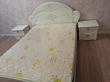- Кровать двуспальная с высокой изогнутой спинкой и резным орнаментом. Матрас на фото.