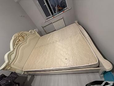 - Кровать двуспальная с высоким резным изголовьем и изящным изножьем. Основание с ламелями; на фото — матрас стандартного размера около 160–180 см по ширине (ориентируйтесь по двуспальному формату).