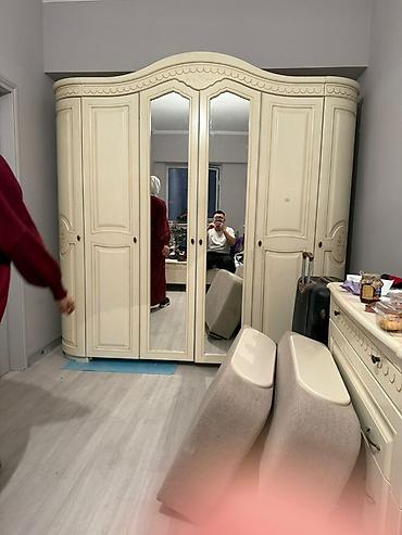 Подойдет для спальни в классическом или неоклассическом стиле: единый комплект мебели, в котором сочетаются хранение (шкаф и комод), туалетная зона с зеркалом и полноценное спальное место.