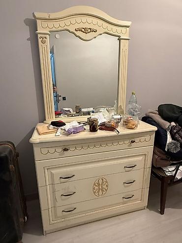- Комод широкий с тумбой-столешницей и большим зеркалом. Три выдвижных ящика с металлическими ручками; над ними — узкий «секретер» под мелочи. Зеркало в резной раме с декоративным карнизом.
