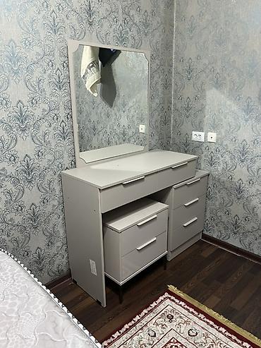 - Туалетный столик/комод с зеркалом: широкий столешница, центральный выдвижной ящик, тумба с тремя ящиками справа и отдельная приставная тумба/пуф‑тумба слева на ножках.