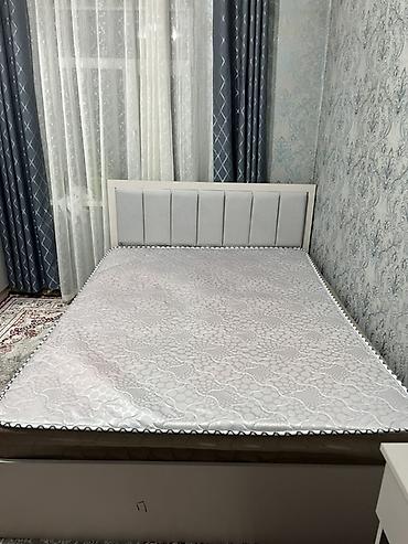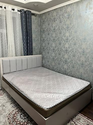 - Кровать двуспальная с мягким вертикально простёганным изголовьем. Корпус в лаконичном дизайне, высокое изножье. На фото установлен матрас стандартной высоты.