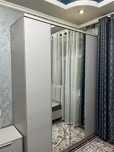 - Шкаф-купе/распашной на 3 отделения с большим зеркалом на центральной двери. Гладкие фасады, длинные ручки, достаточная глубина для хранения одежды.