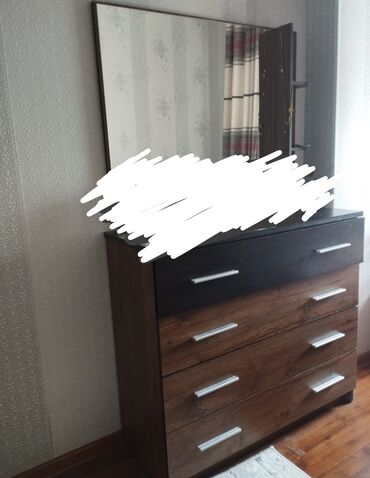 - Комод с большим навесным/стоящим зеркалом. Четыре выдвижных ящика на направляющих, широкие серебристые ручки.