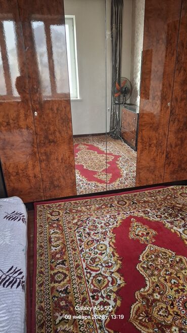 - Трёхстворчатый шкаф-купе/распашной (на фото — четыре секции с центральными зеркальными дверями). Большое зеркало во всю высоту визуально расширяет пространство и удобно для примерки.