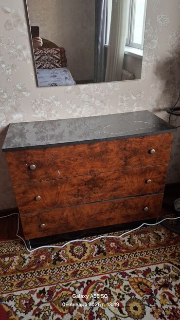 - Комод на 3 выдвижных ящика. Столешница с темной глянцевой/«мраморной» поверхностью, удобной для ухода.