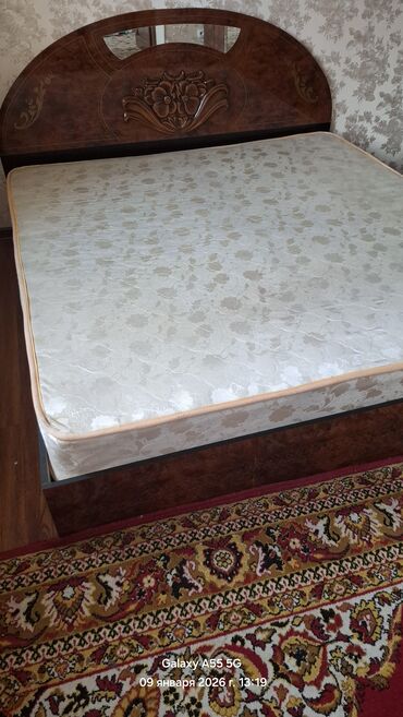 - Двуспальная кровать с высоким изголовьем с декоративной резьбой и зеркальной вставкой. Матрас пружинный в тканевом чехле с цветочным жаккардовым рисунком.