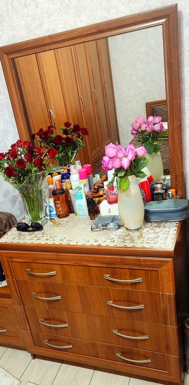 - Комод с четырьмя глубокими выдвижными ящиками, сверху большое настенное зеркало в раме.