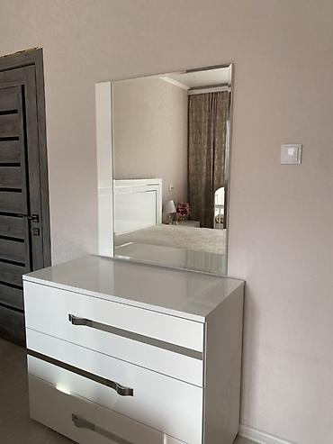 - Комод на 3 выдвижных ящика, глянцевая столешница; сверху навесное большое прямоугольное зеркало в тон гарнитура.