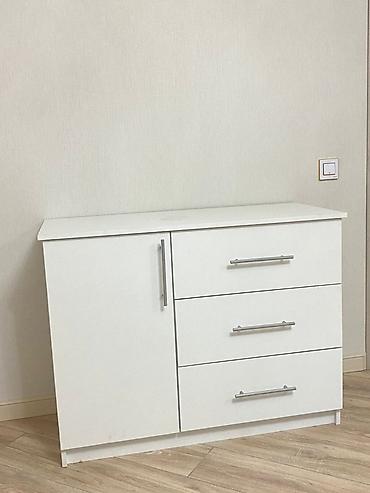 - Комод с тремя выдвижными ящиками и одной распашной секцией, металлические ручки.