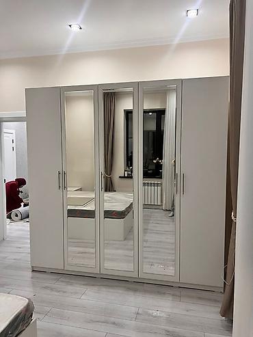 - Шкаф-купе/распашной на 4 двери: две центральные двери с большими зеркалами во всю высоту, боковые глухие. Внутри — секции под вешала и полки (классическая компоновка для одежды).