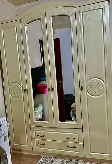 - Шкаф платяной 5‑дверный с двумя зеркалами по центру и двумя выдвижными ящиками внизу. Внутри секции для вешалок и полки.