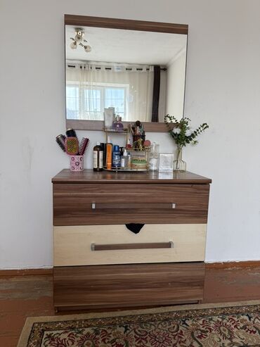 - Комод с большим настенным зеркалом. Три широких выдвижных ящика, фасады комбинированные (орех/беж), ручки металлик.