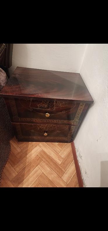 - Прикроватные тумбы с двумя выдвижными ящиками, в том же исполнении: глубокий темный глянец, орнамент «греческий ключ» по периметру, золотистая фурнитура.
